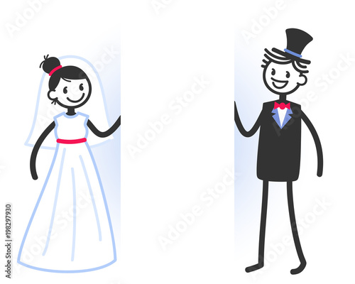 Vector wedding illustration of cute stick figures bridal couple with blank white space for your text isolated on white background, wedding invitation template - Buy this stock vector and explore similar vectors